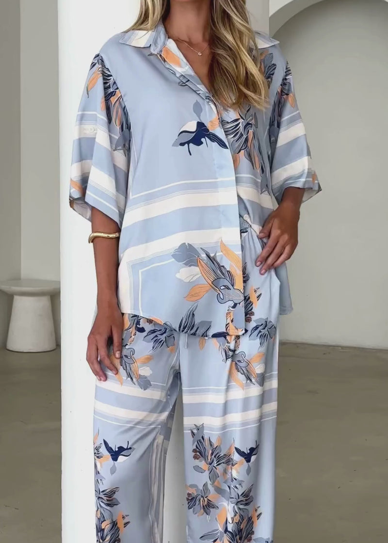 Soft florals in a powder blue hue make the Kaycie Pants an elegant staple. Wear them with the Kaycie Shirt for a seamless co-ord, paired with straight hair pinned back with a delicate hair clip. Finish with nude block heels, a woven handbag, and pearl drop earrings for a timeless daytime look.