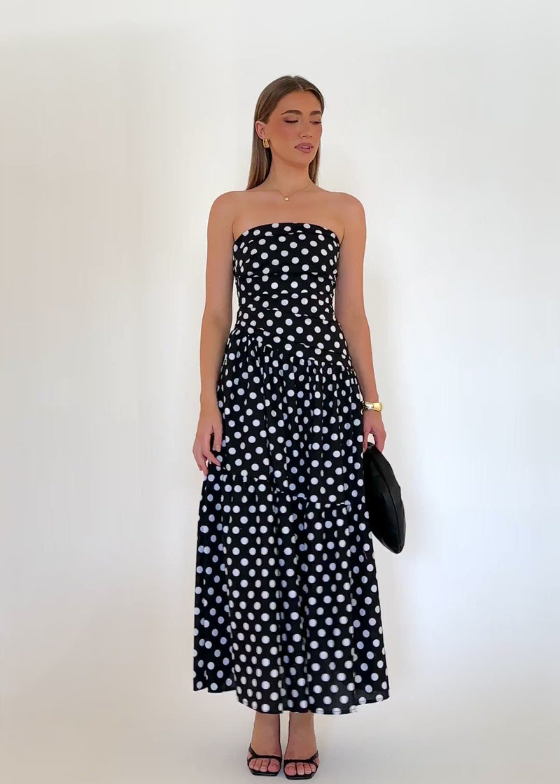 Chic and timeless, the Abie Strapless Maxi Dress – Black Polka is ideal for dinners, parties, or summer celebrations. Pair with statement earrings, heels, and a structured clutch. Tap to shop and enjoy classic polka styling with modern edge.