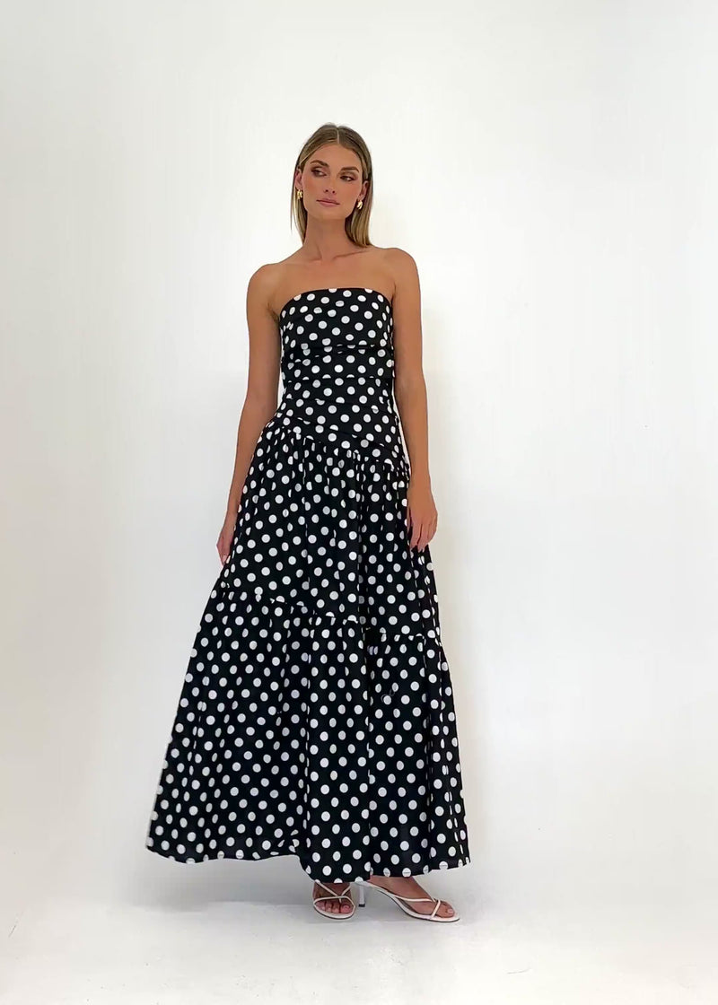 Chic and timeless, the Abie Strapless Maxi Dress – Black Polka is ideal for dinners, parties, or summer celebrations. Pair with statement earrings, heels, and a structured clutch.