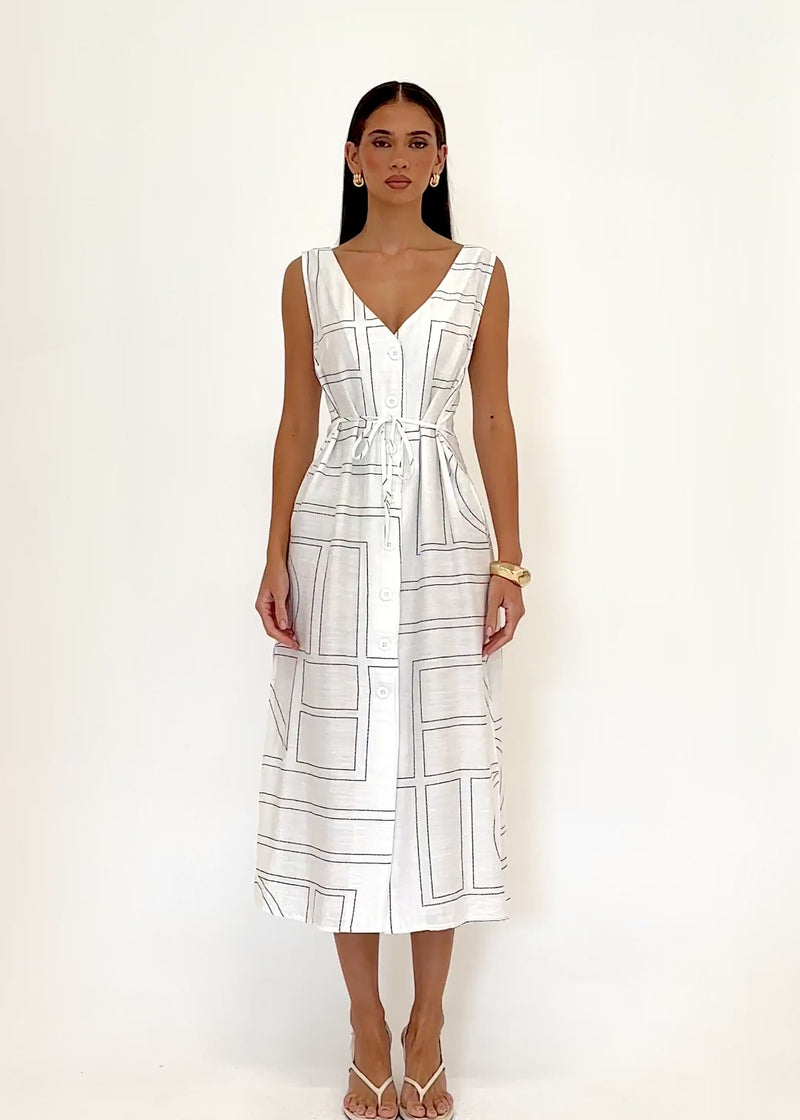 Bold print meets clean lines in the Aelinda Midi Dress – White Geo. Perfect for brunches, garden parties, or weekend outings, style with strappy sandals and a mini bag. A white geometric midi dress that keeps your look modern and polished.