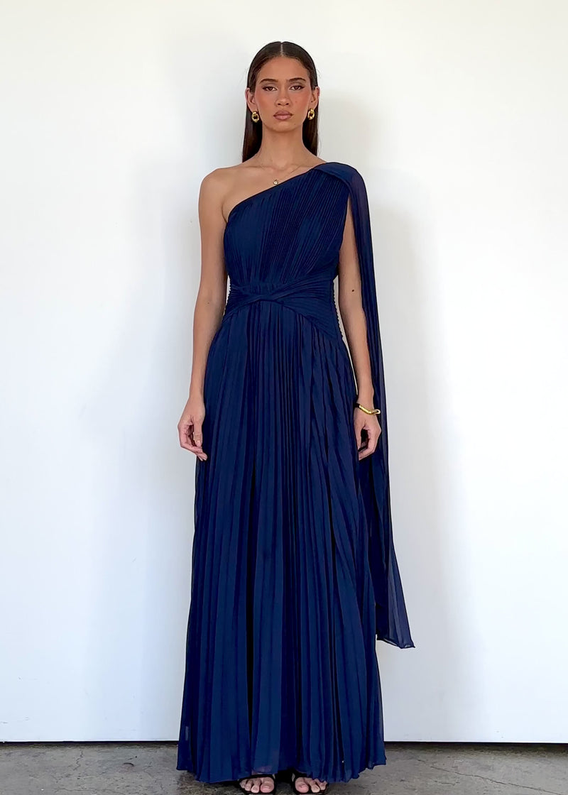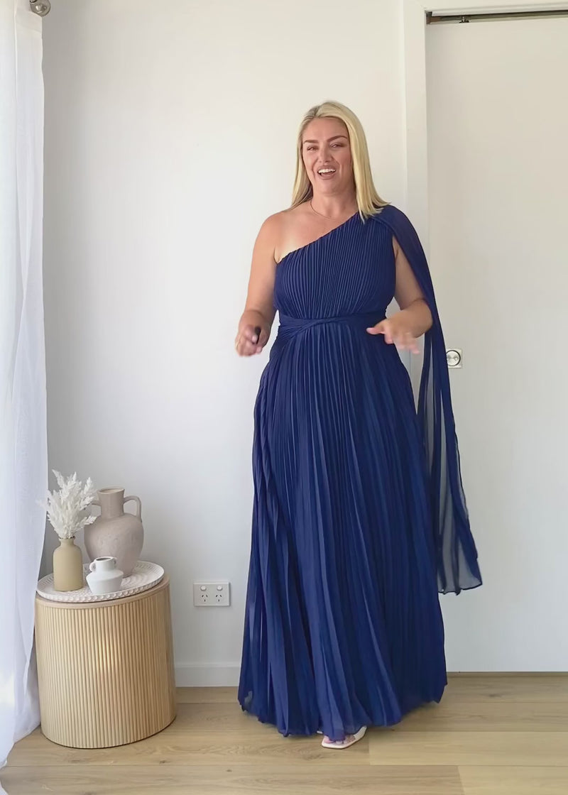 Step into sophistication with the Affirmation Maxi Dress in Navy. The one-shoulder pleated design gives timeless grace with a modern twist. Style it with silver heels, a soft clutch, and sleek hair for your next formal event.