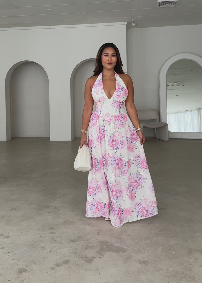 Elevated and feminine, the Afia Halter Embroidered Maxi Dress – Pink Flowers is perfect for formal celebrations, dinners, or romantic nights out. Pair with strappy heels and pearl details.