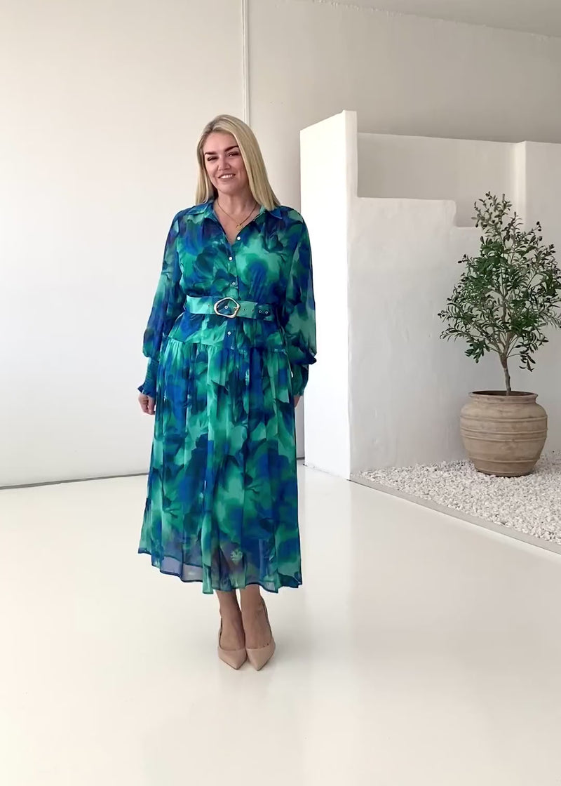 Select a graceful option for your collection with the Aleera Midi Dress, showcasing a lovely blue floral print. For a relaxed daytime event, pair it with flat sandals and a large tote bag. For an evening appearance, opt for heeled mules and delicate accessories for a cohesive finish.