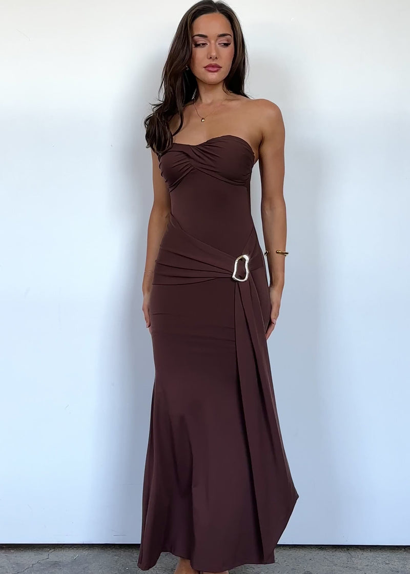 The Alexza Strapless Maxi Dress in chocolate brings understated elegance to special occasions. Pair with nude heels, drop earrings, and a soft shawl for a romantic evening look.