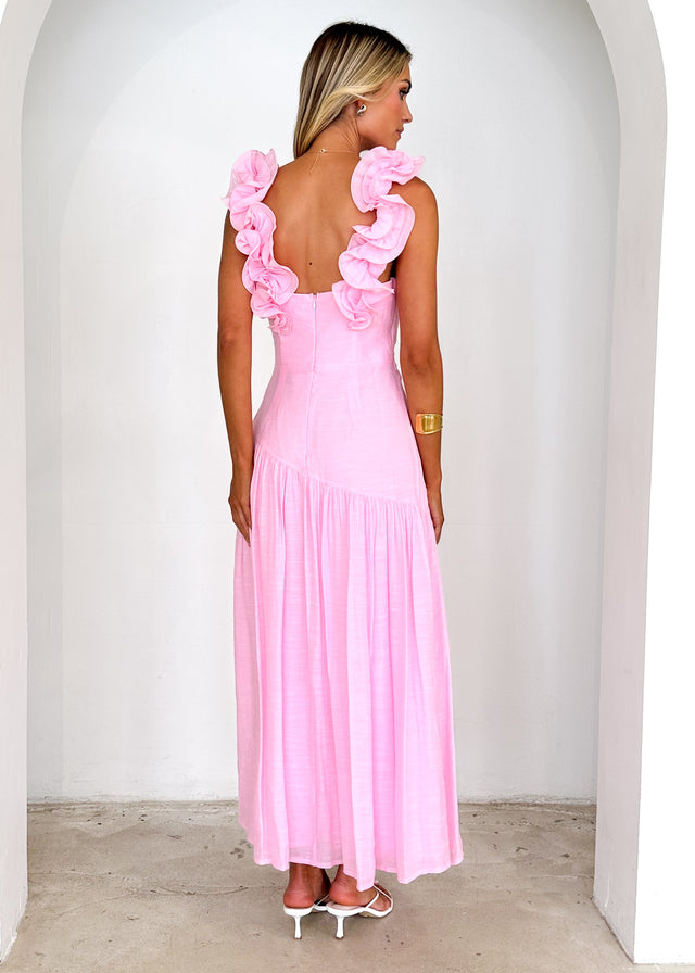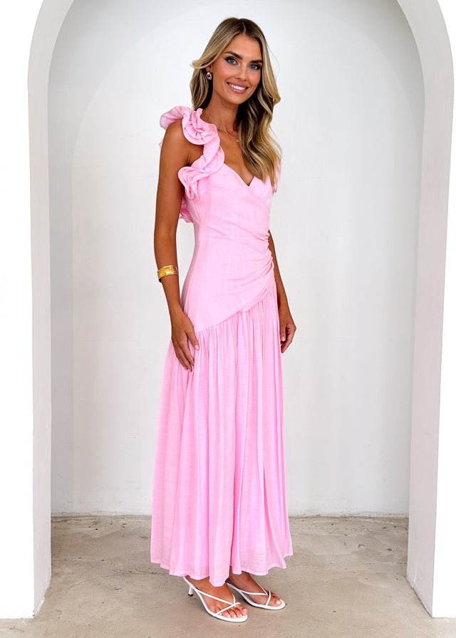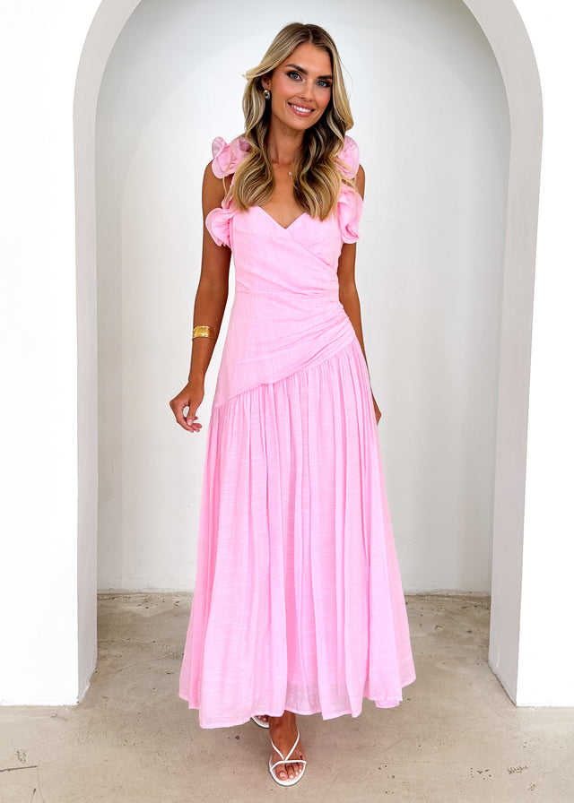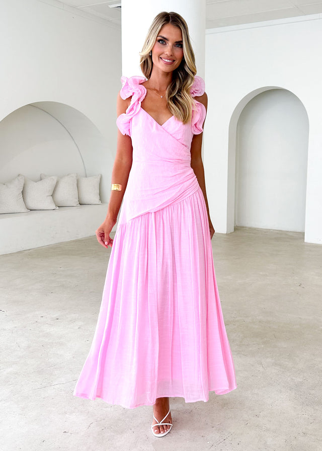 The Allara Maxi Dress in blush exudes soft sophistication, with delicate ruffled sleeves and a unique asymmetrical waistline. Pair it with silver heels and wear your hair in loose waves for a graceful, romantic vibe. Complete the look with simple pearl jewellery and a matching blush-toned clutch for effortless style. Embrace timeless elegance with the Allara Maxi Dress in blush—shop today!
