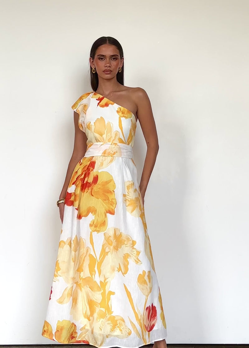 Radiate confidence in the Alvaro One Shoulder Midi Dress, a marigold statement piece blending sculpted elegance with effortless stretch. Perfect for summer soirées and golden-hour styling. Pair with gold heels for a luminous finish.