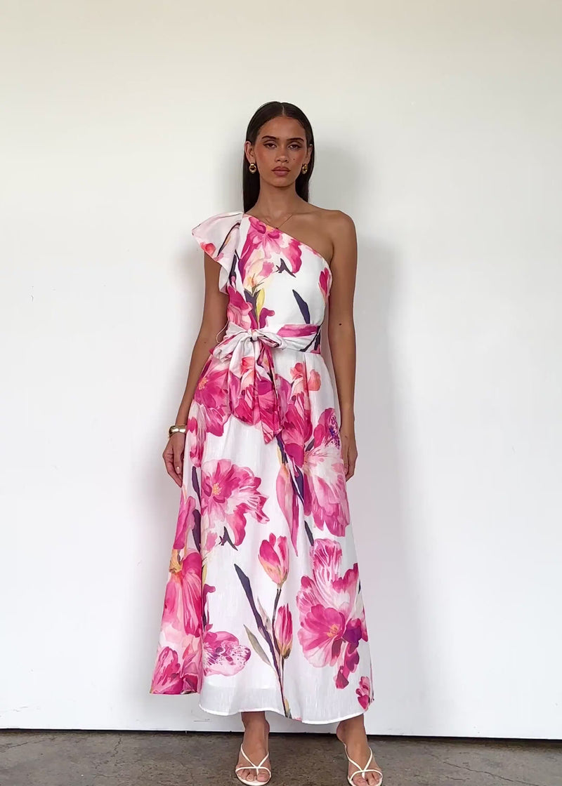 Step into soft romance with the Alvaro One Shoulder Midi Dress in pink peony, crafted for flattering elegance and comfortable wear. Ideal for brunch dates, weddings and special celebrations.