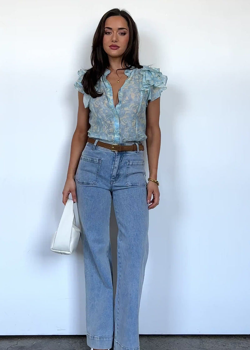 The Alyssia Blouse in sky blue floral makes everyday dressing effortless. Tuck into denim for coffee dates, or pair with tailored trousers and loafers for a chic office vibe.