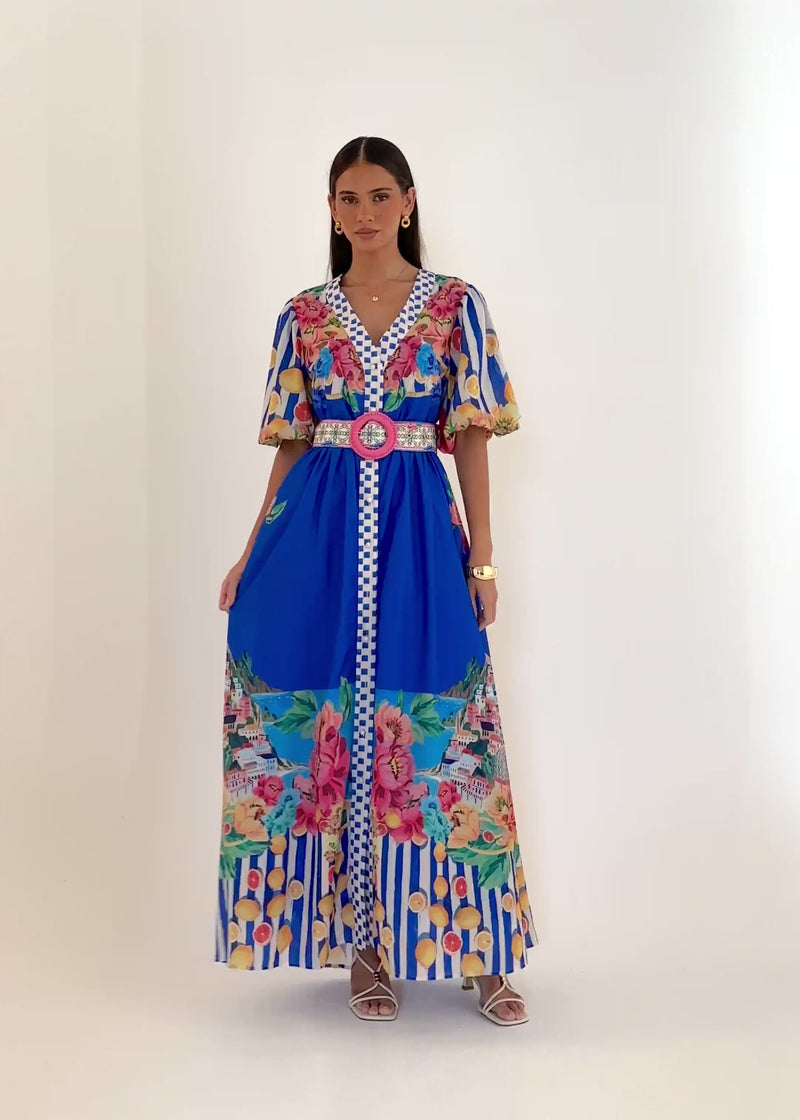 Striking and coastal-inspired, the Ambre Maxi Dress – Positano Cobalt is perfect for holidays, dinners, or summer events. Style with gold accessories and wedges.