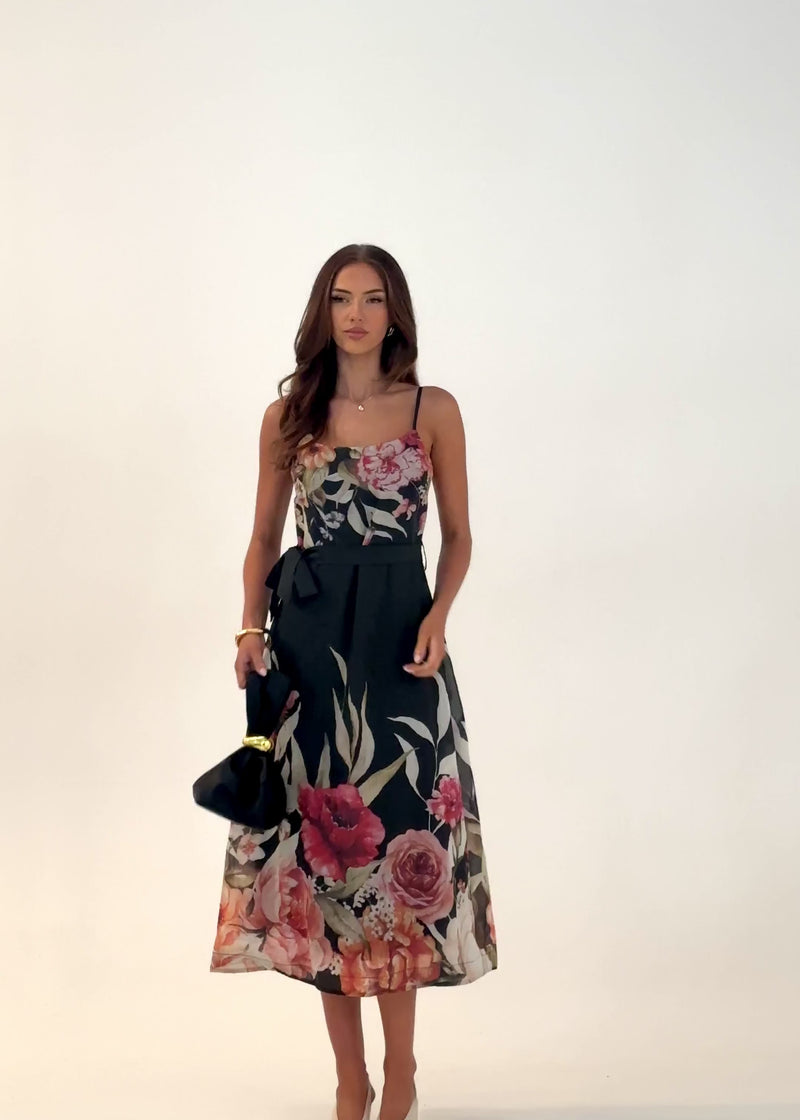 Chic and versatile, the Andrea Midi Dress - Black Garden works with heels and a clutch for evening occasions or trainers and a denim jacket for a casual edge. A floral favourite that transitions with ease.