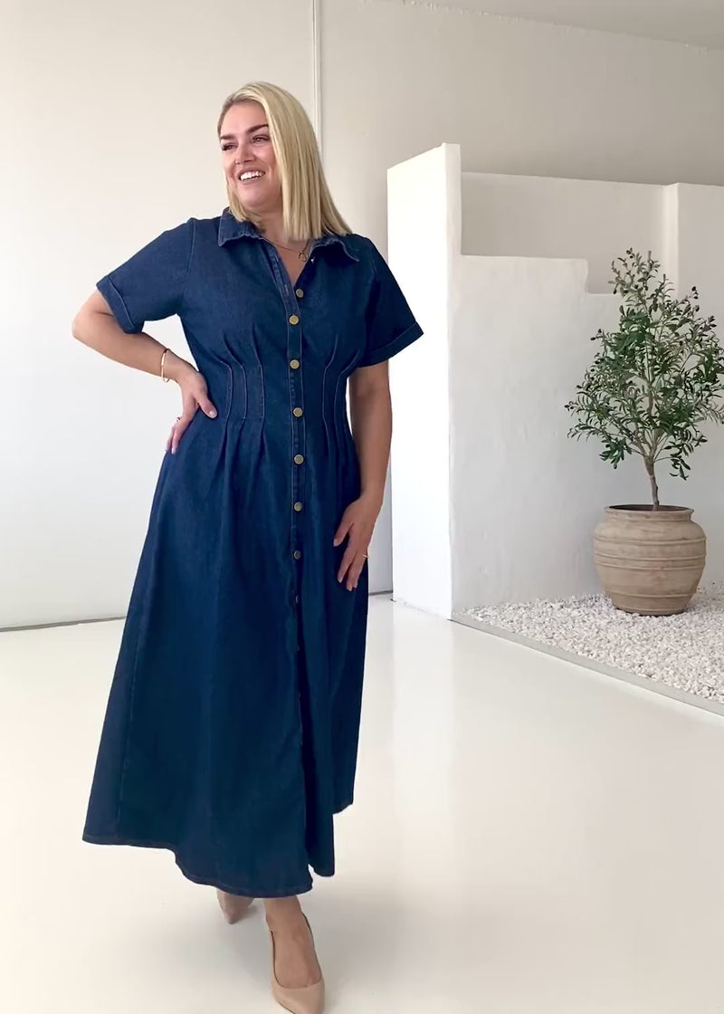 The Annika Dress in indigo denim is your casual-day upgrade. The button-front and midi length keep things classic, while white trainers or loafers complete the look.