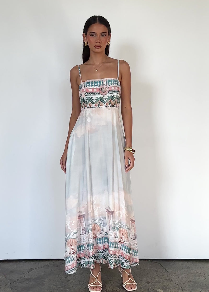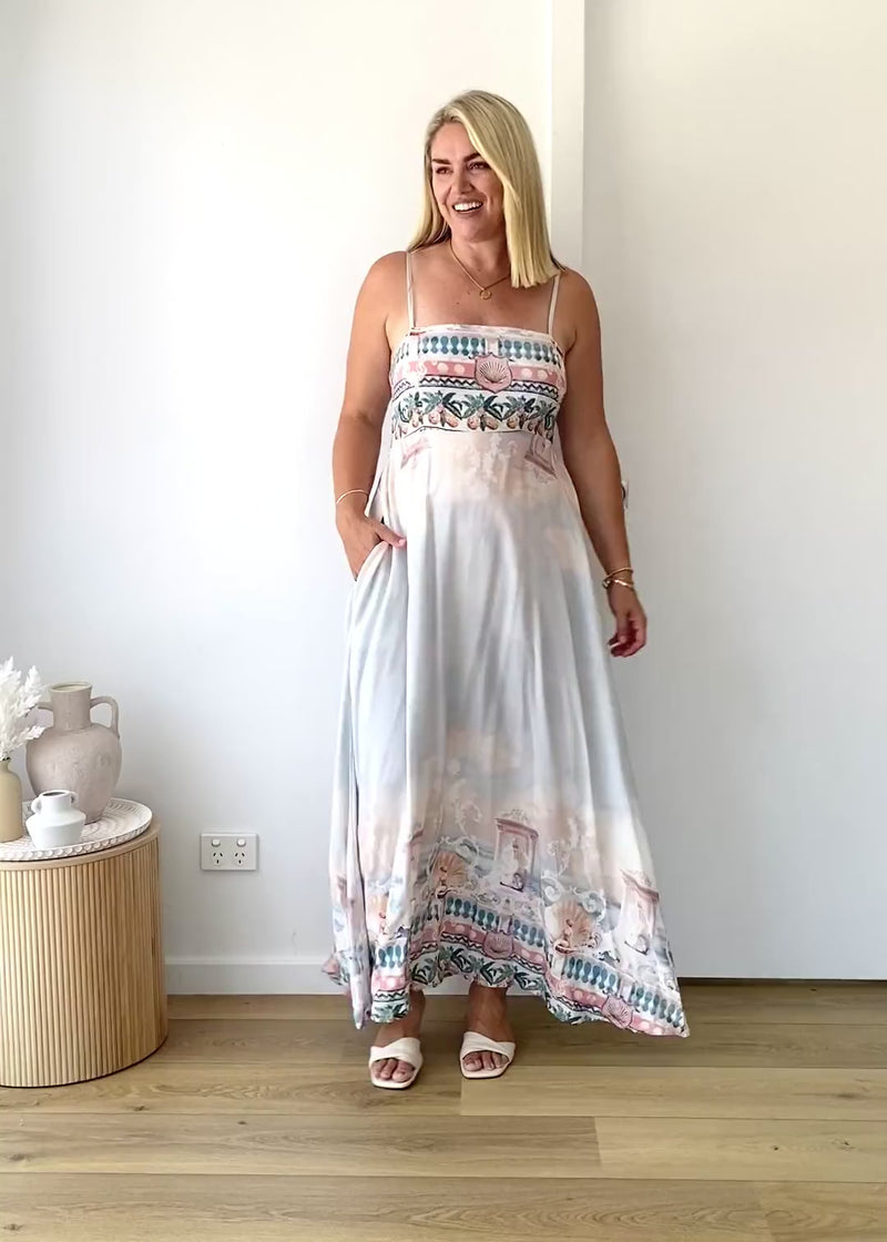 Dive into summer with the Artemis Maxi Dress in Siren Seas. Its flowy silhouette and ocean hues make it perfect for resort dinners or city strolls. Just add slides, statement hoops, and a tan bag for that chic coastal feel.
