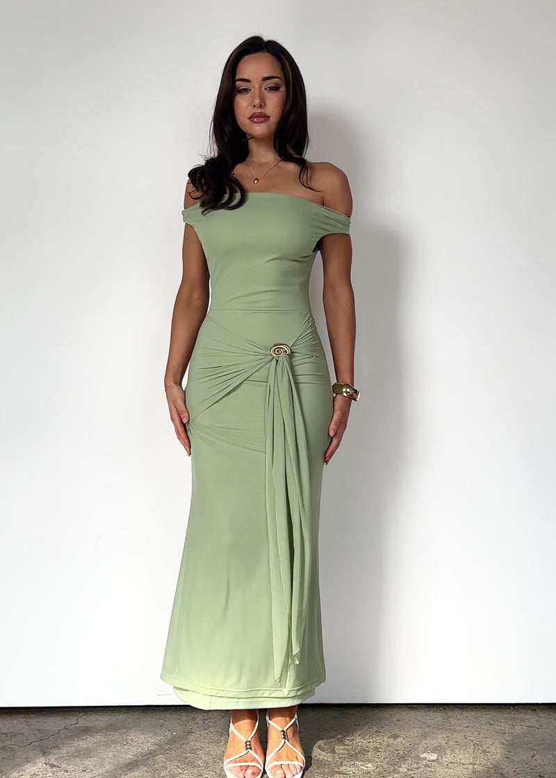 Own that soft glam vibe with the Asha Off Shoulder Maxi Dress - Sage. Style it with strappy nude heels, a clutch, and delicate drop earrings for dinner nights or weddings.