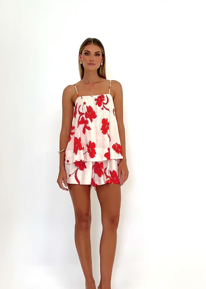 Stay playful wearing Avaah Playsuit - Red Flowers for a festival or beach day. A vibrant red print and comfortable short cut keep a look fun and energetic throughout warm afternoons. Match this piece with platform sneakers and a small nylon crossbody bag for a practical yet chic ensemble.