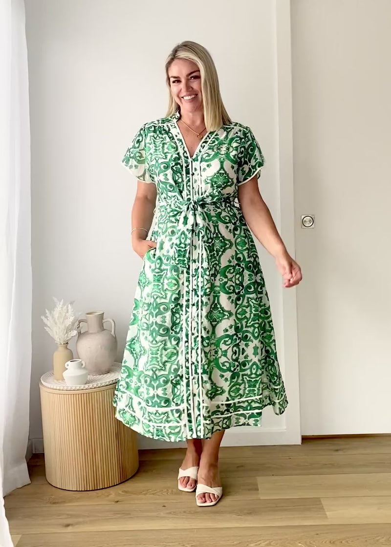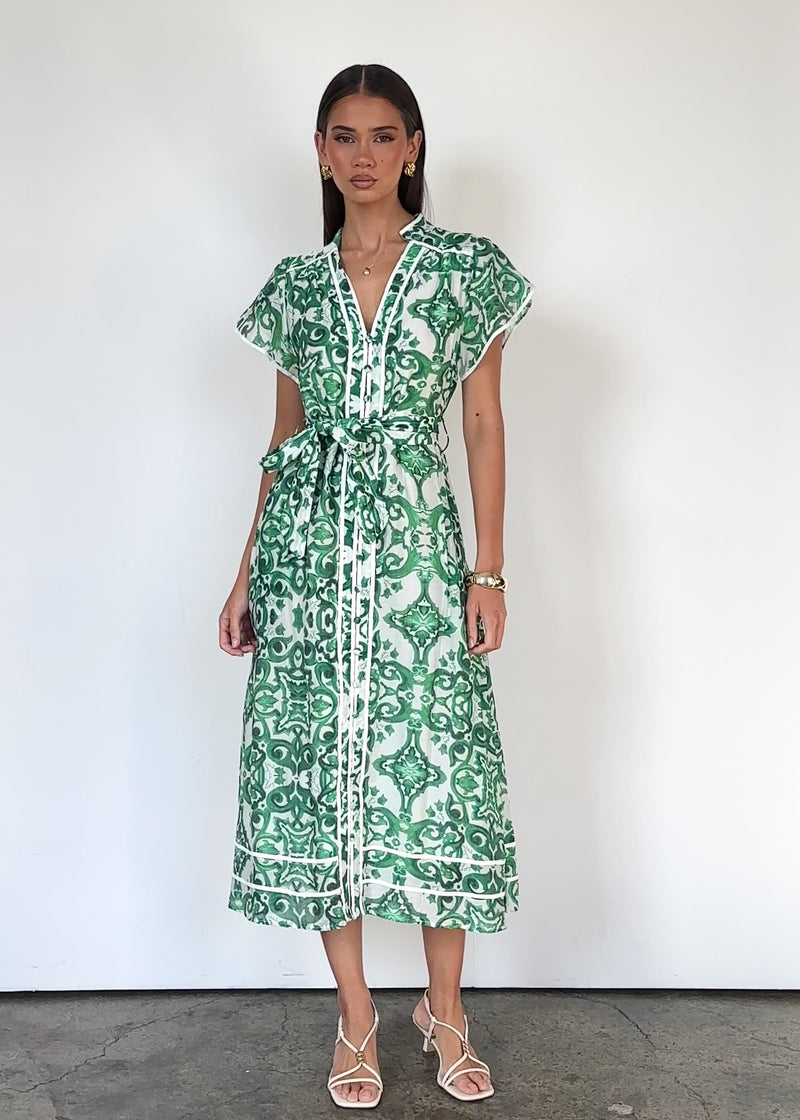 Make a statement in the Avalon Maxi Dress in Emerald Geo. Its vibrant geometric print and flattering flow make it perfect for resort getaways or weekend gatherings.