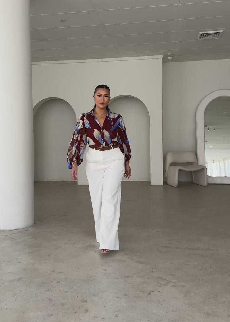 Add sophisticated flair with the Avina Shirt in burgundy Anya print. Wear loose with jeans for casual chic or tucked into trousers for polished office looks.