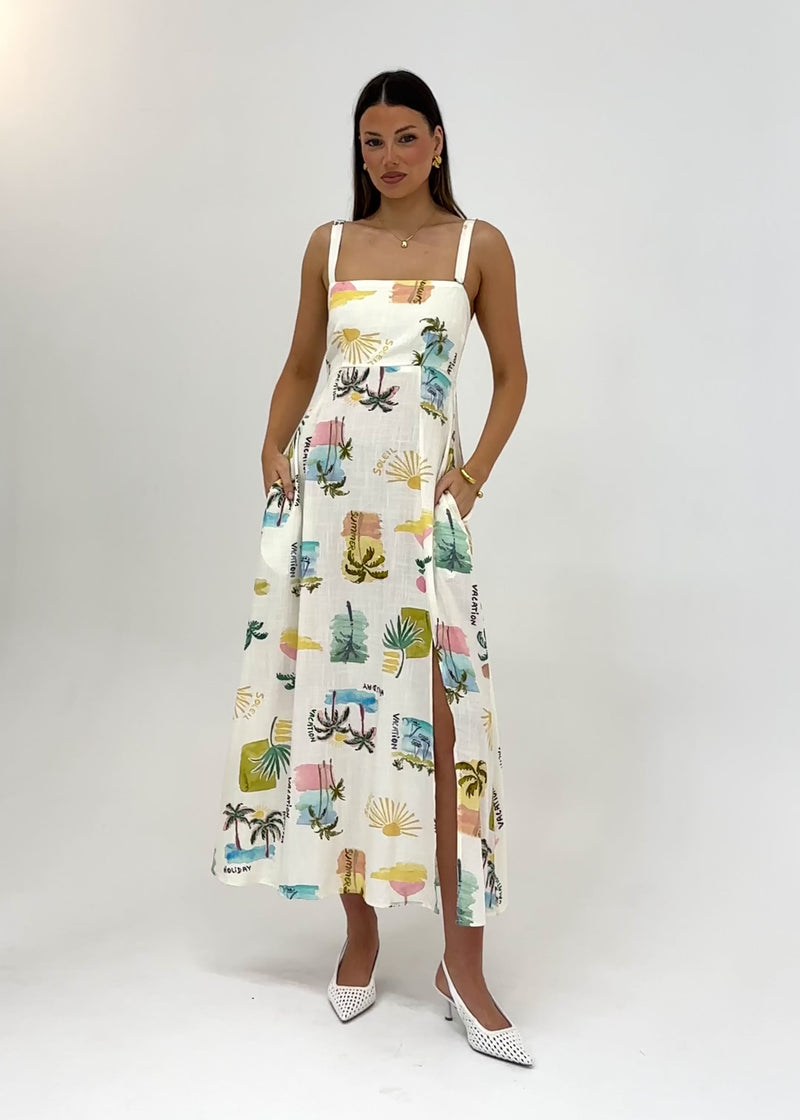 Vibrant and flowy, the Baja Maxi Dress - Helia is ideal for beach holidays, daytime events or relaxed dinners. Style with slides and a straw tote by day, or strappy heels for evenings.