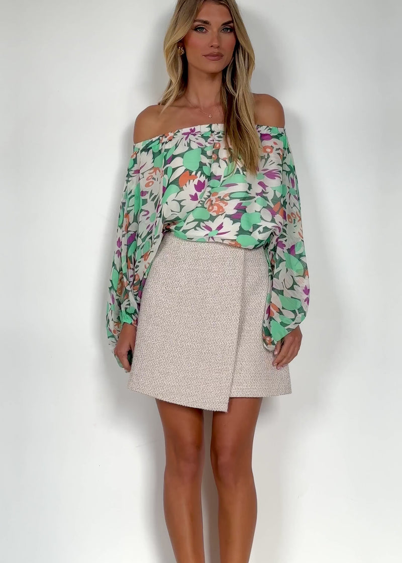Vibrant and flattering, the Bexley Off Shoulder Top in Rio Green pairs beautifully with skirts or tailored trousers. Complete your look with soft waves, strappy sandals, and layered necklaces. Add a simple clutch for a polished finish.