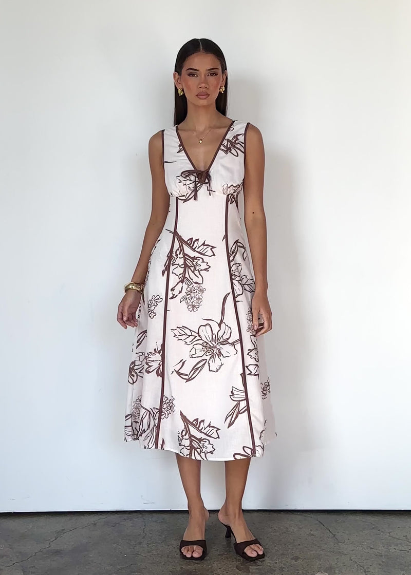 The Blakie Midi Dress in chocolate bloom is your go-to for effortless chic. Pair with mules and layered necklaces for day plans, then dress it up with heels and a clutch when the night calls. A versatile staple that keeps you looking put-together with zero effort.
