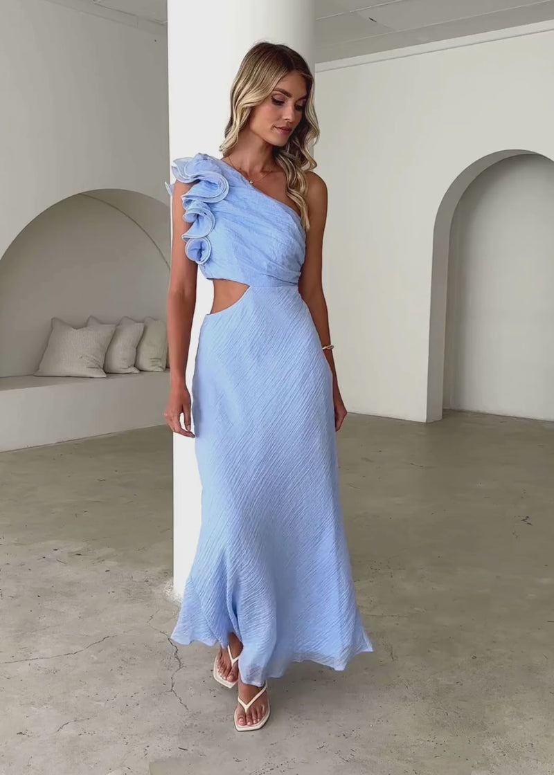 Effortlessly stylish in sky blue, the Britt One Shoulder Maxi Dress offers a flattering silhouette with its elegant one-shoulder design. Pair it with strappy sandals and bold earrings for evenings, or keep it laid-back with a denim jacket and flats. Perfect for warm days and nights.