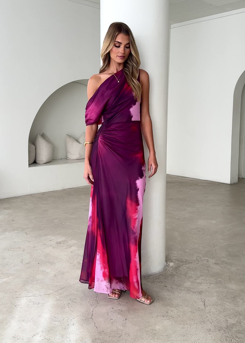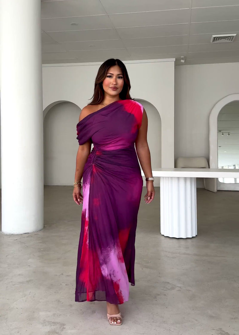 Bold and effortlessly chic, the Byron One Shoulder Maxi Dress in Plum Tie Dye is a statement piece for any occasion. With its striking one-shoulder design and fluid silhouette, this dress moves with grace and elegance. Pair it with strappy heels and gold accessories for a head-turning evening look.