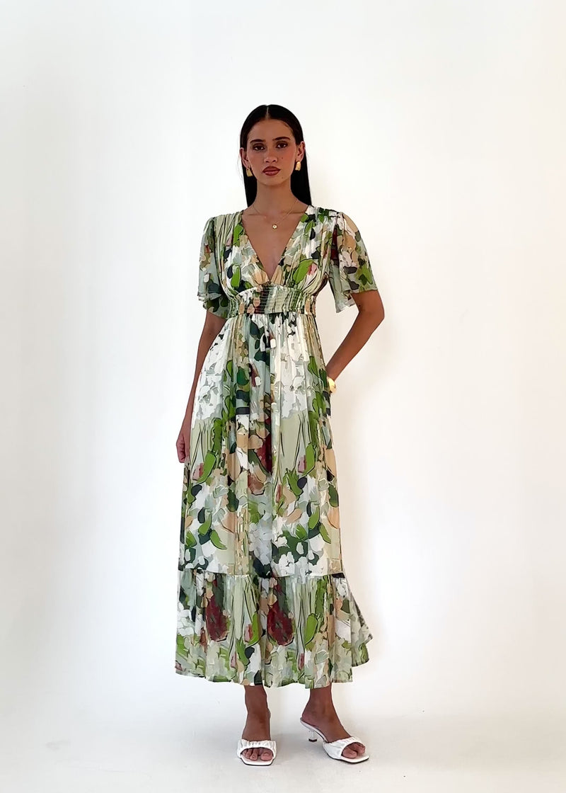 Turn heads at summer soirées and beach weddings with the Cara Maxi Dress in Green Abstract. Pair this captivating dress with a stylish crossbody bag for a modern twist. Enhance your look with statement gold jewellery to complete your ensemble.
