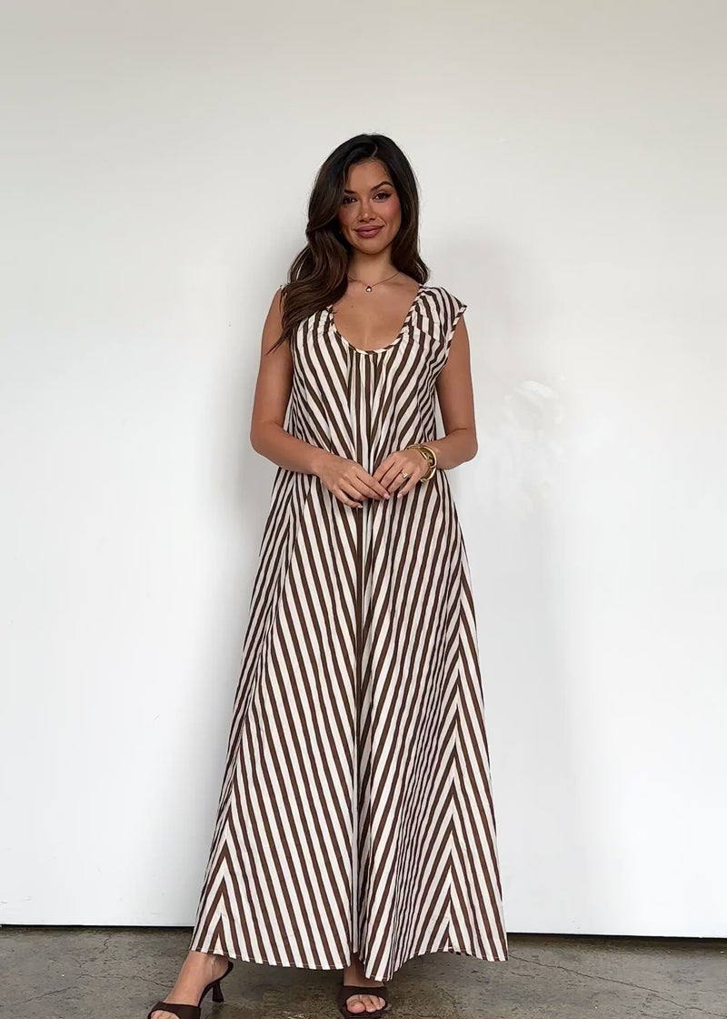 The Casandra Maxi Dress in chocolate stripe marries soft neutrals with clean lines. Work with ankle boots and a leather jacket for cool city nights, or slip on sandals and a straw bag for resort weekends.