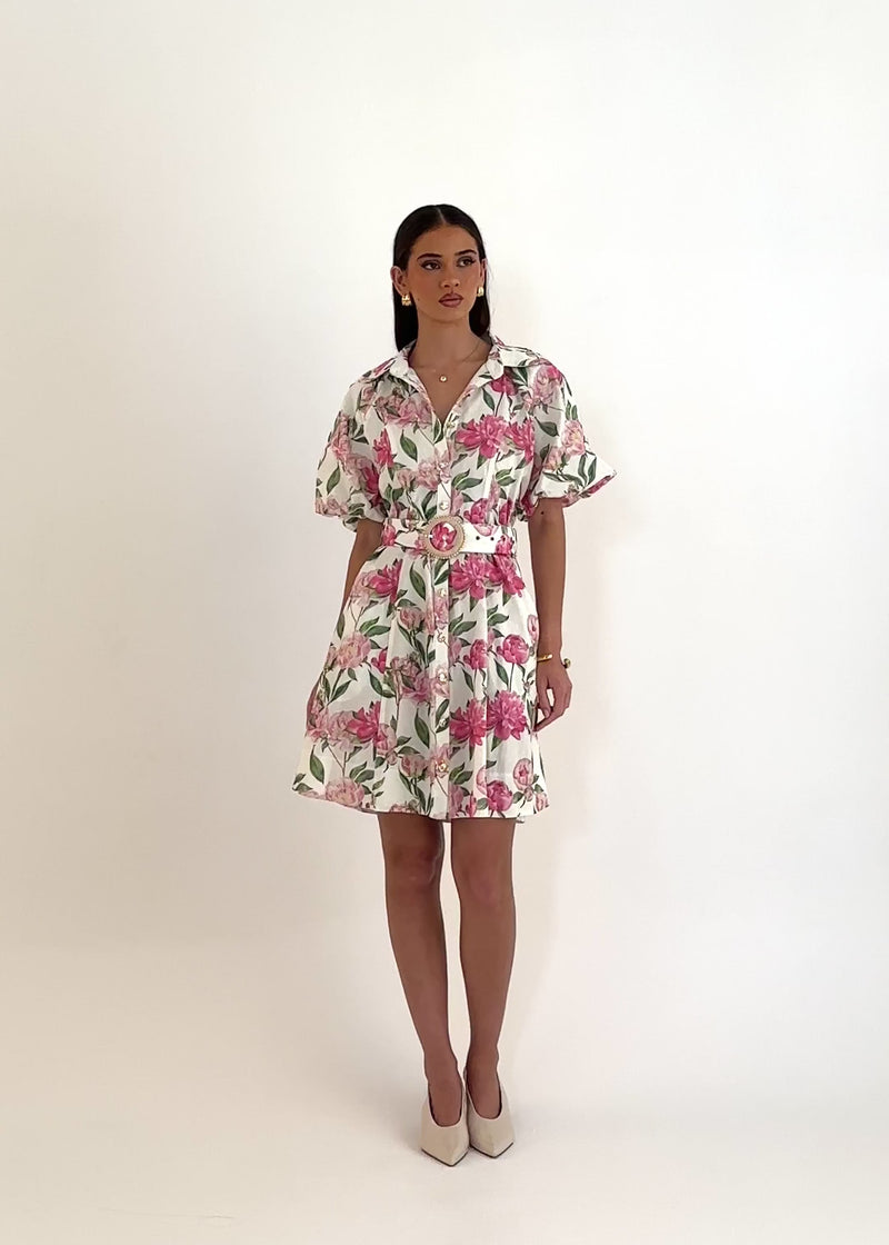 Floral with flair, the Charlston Dress in pink peony is ideal for garden strolls or birthday brunches. Style with nude heels and layered necklaces, or dress it down with slides and a straw tote.