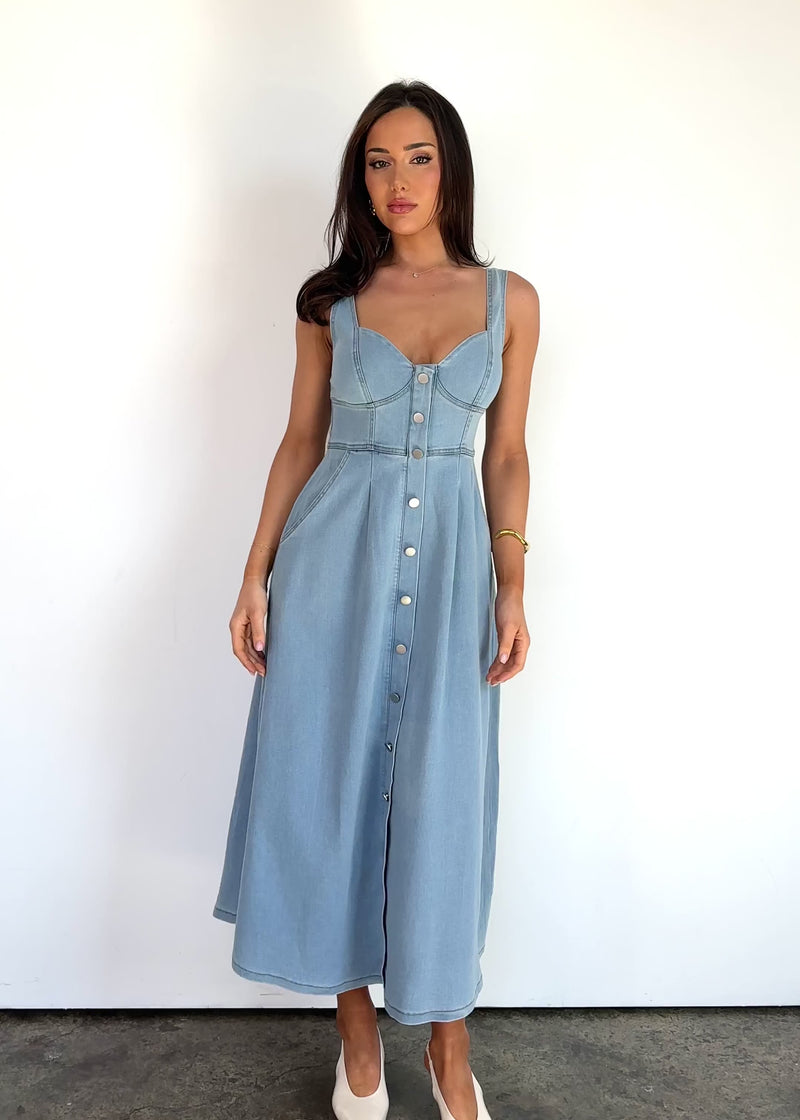 Casual meets chic in the Deja Denim Midi Dress - Light Blue, perfect with trainers and a crossbody for daywear or heels and statement earrings for a polished evening look. A denim favourite with a fresh twist.