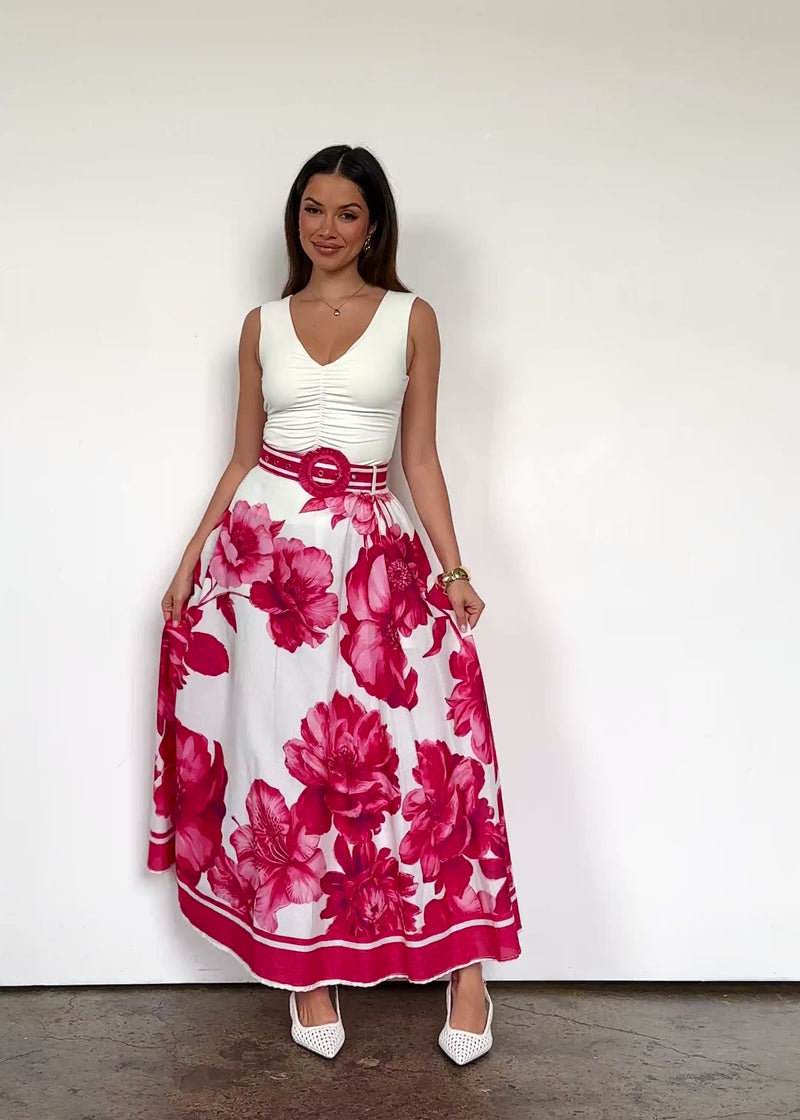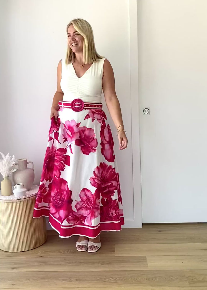 Effortless and elegant, the Dejana Maxi Skirt in ruby dahlia print is perfect with a white tank and strappy flats for sunny days, or a silk cami and heels for night out.