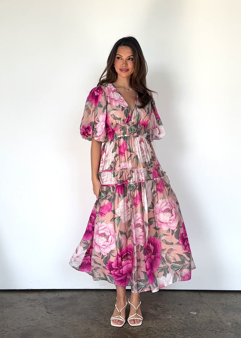 Bloom into any occasion with the Desima Maxi Dress. Its blush floral print and floaty silhouette make it your go-to for springtime events. Add strappy sandals and gold accessories to complete the effortlessly pretty vibe.