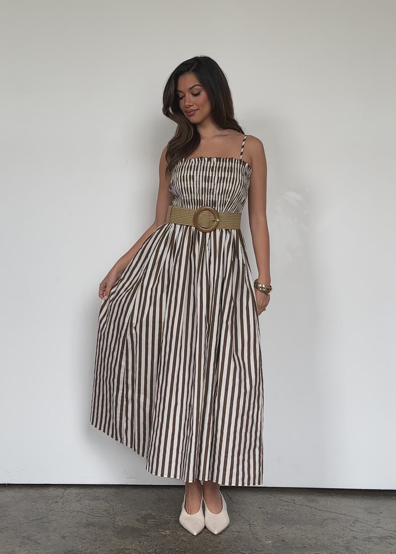 The Elese Maxi Dress in Choc Stripe gives easy elegance with a modern edge. Its flattering flow is ideal for brunches or weekend getaways. Style with tan sandals, layered necklaces, and a straw tote for a relaxed chic vibe.