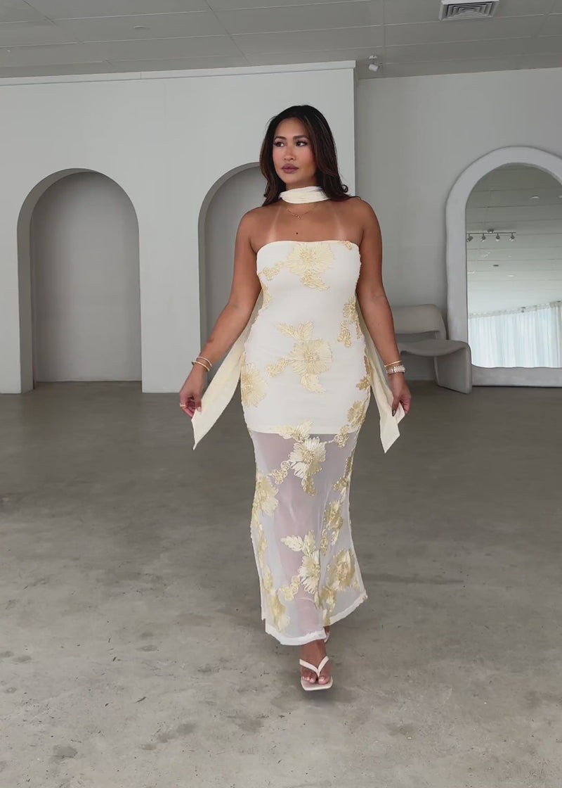 Soft, elegant, and romantic, the Elias Strapless Mesh Maxi Dress – Butter Embroidered suits weddings, milestones, and evening events. Style with nude heels and delicate jewellery.