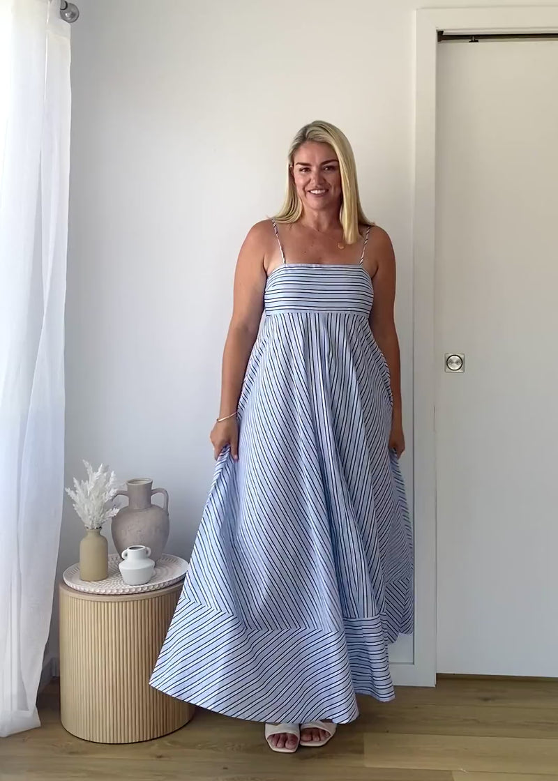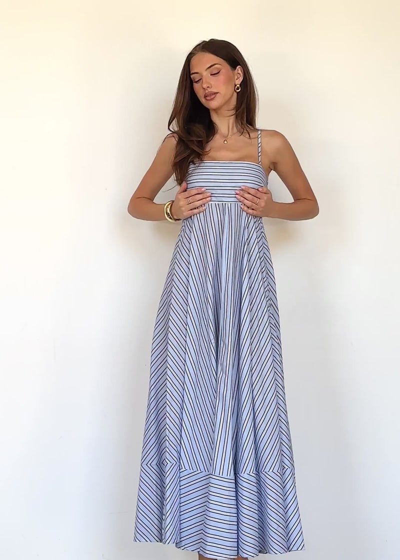 Holiday ready in the Elide Maxi Dress - Blue Stripe! Pair with espadrilles, a straw tote, or blazer for smart dinners. Add layered necklaces for extra flair. Perfect seaside or summer wedding vibes.