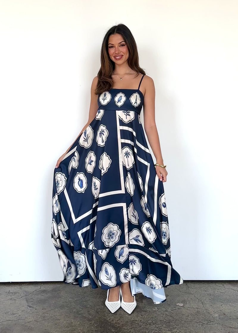 Flowy, flattering, and timeless — the Elide Maxi Dress brings that dreamy coastal energy. The navy and white combo makes it easy to dress up or down. Try it with tan sandals and a woven bag for those long lunch dates.