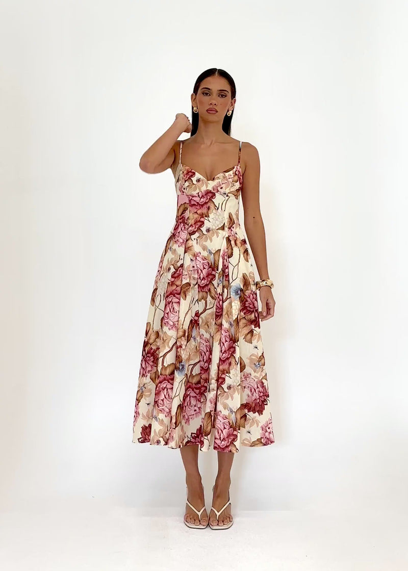 Fresh and romantic, the Emeline Midi Dress – Beige Garden is a floral midi dress made for garden parties and daytime events. Style with strappy sandals and pearl earrings for a soft finish, or elevate with heels and a structured bag. The beige garden print keeps it light and versatile.