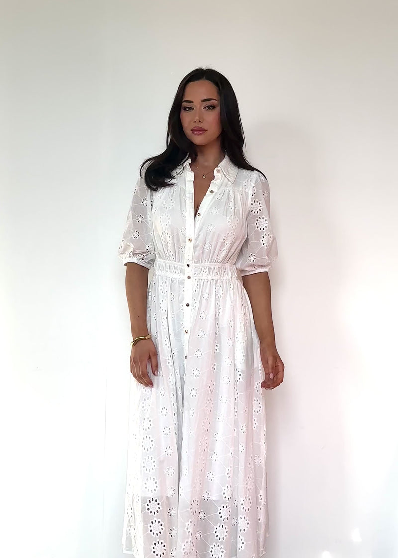 Fresh and crisp, the Eryn Midi Dress - White Anglaise is your go-to for summer days, holidays and casual parties. Style with sandals and a raffia bag for coastal vibes or elevate with wedges for relaxed elegance. A wardrobe staple for warm Australian days.