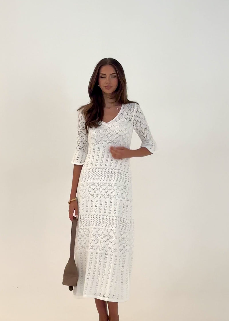 Breezy and romantic, the Estrela Crochet Midi Dress - Off White is perfect with wedges and a straw bag for garden parties or barefoot on the sand for sunset drinks. A timeless style that moves easily from coastal days to evening soirées.