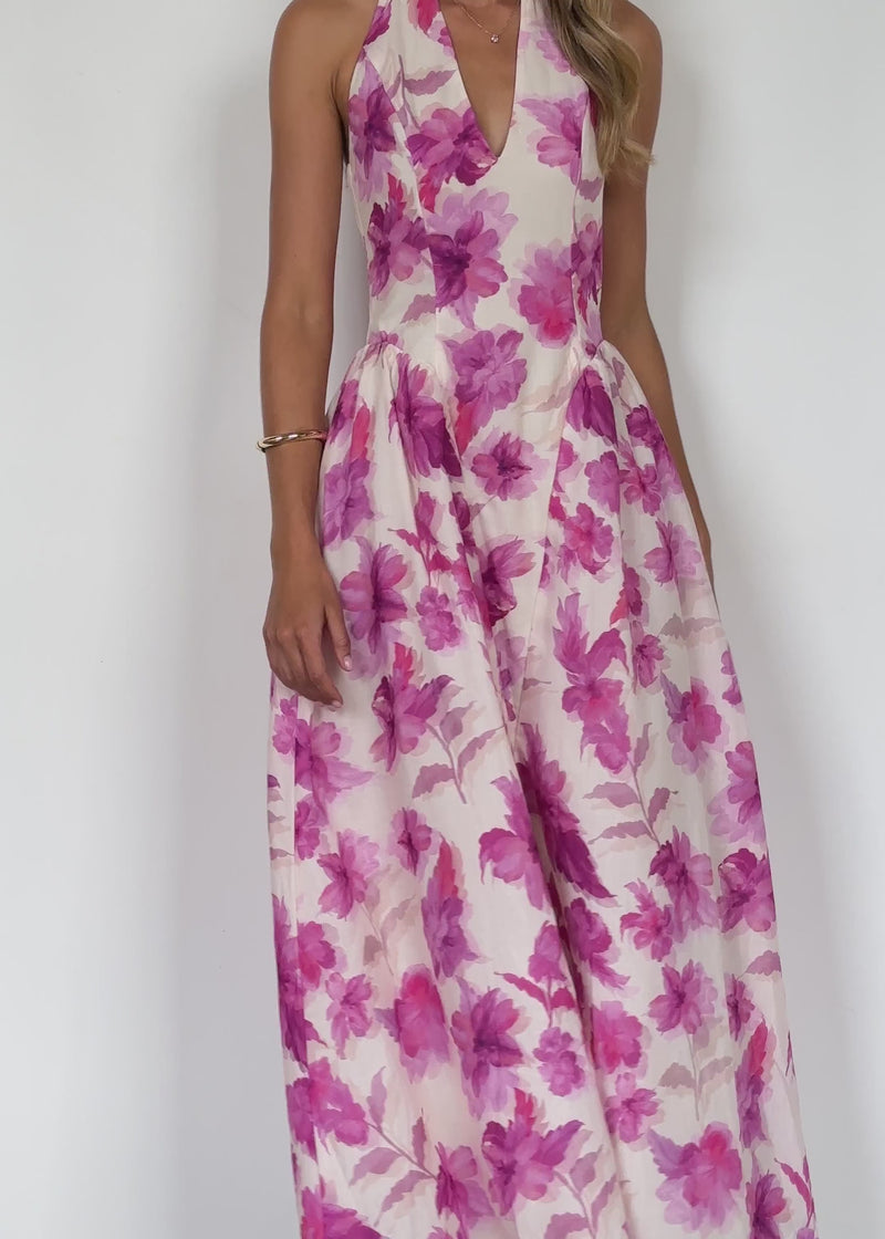 Fall in love with the Faithless Halter Maxi Dress in Pink Flowers. Breezy, romantic, and made to move with you—it's perfect for sunny celebrations, holidays, or a dressed-up brunch. Style it with strappy heels, a woven bag, and pearl accessories for that soft, feminine finish.