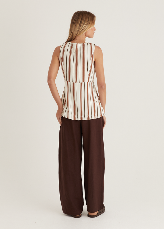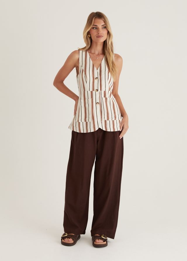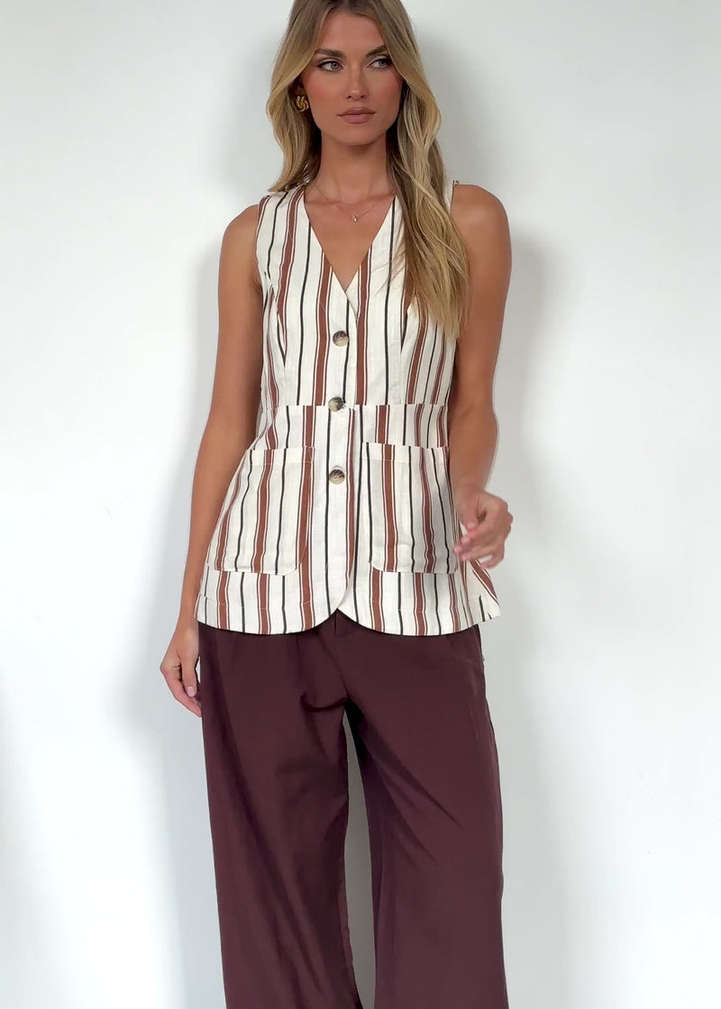 Crafted with style in mind, the Fawn Vest Top in Amber Vale offers a flattering V-neck and front button detailing. Pair it with the matching Fawn Shorts for a chic co-ord look. Complete the outfit with a messy bun, layered necklaces, and comfortable wedges for a laid-back yet stylish vibe.