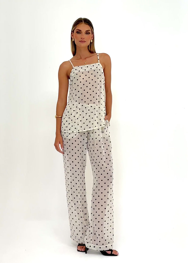 Capture a playful vibe wearing Felecia Cami - Beige Polka Dot. Pair with matching Felecia Pants for a chic coordinated look or tuck into a midi skirt. A classic print adds charm to a daily rotation. A lightweight design keeps a look cool during balmy days while maintaining a refined and elegant edge.