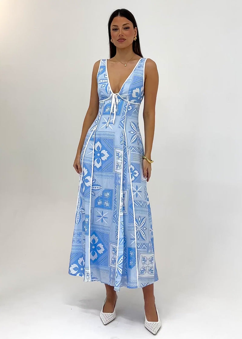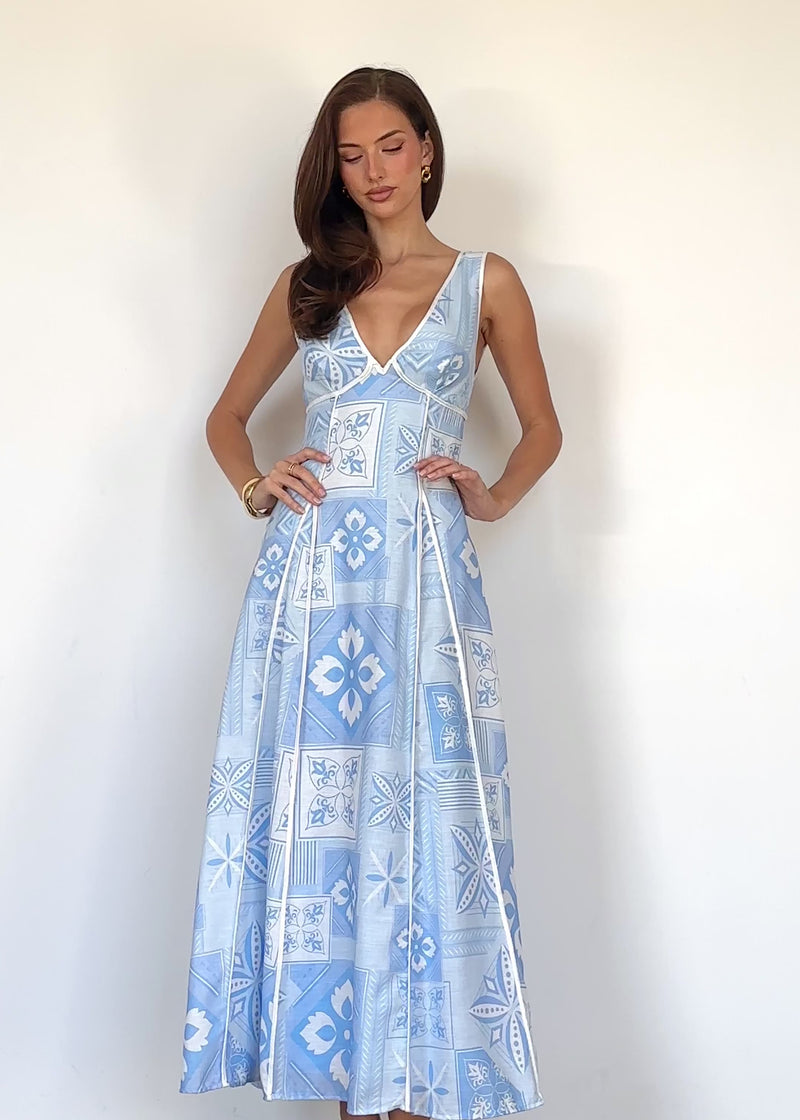 Modern and eye-catching, the Fenix Maxi Dress - Blue Geo is perfect for summer parties, resort escapes and weekend brunches. Style with strappy sandals and a woven bag for daytime, or add heels and bold jewellery to take it into the evening.