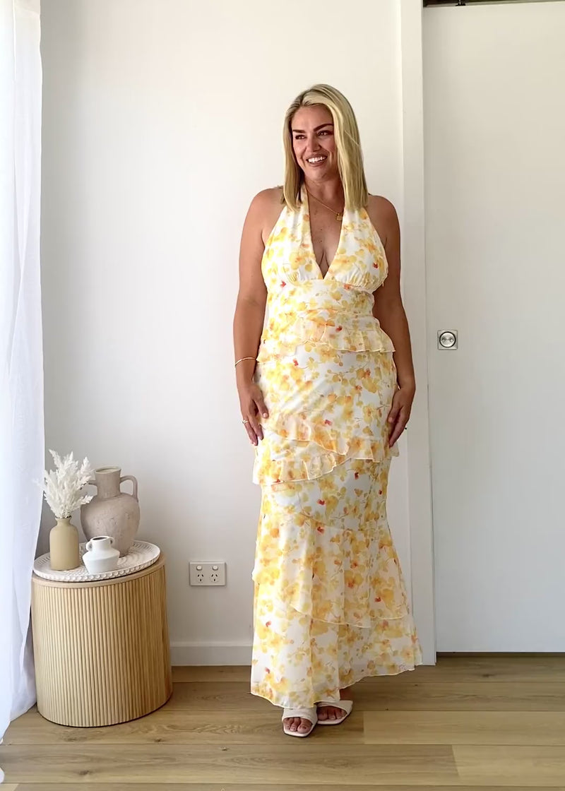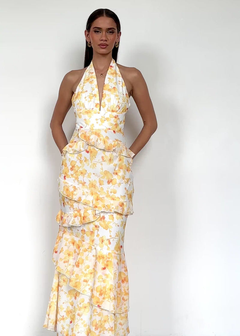 Sunshine-ready and effortlessly chic, the Ferryn Halter Maxi Dress in Yellow Floral is made for warm days and golden evenings. Its breezy halter cut and flowy silhouette bring comfort and style together. Pair it with nude sandals, gold bangles, and a floppy hat for a radiant finish.