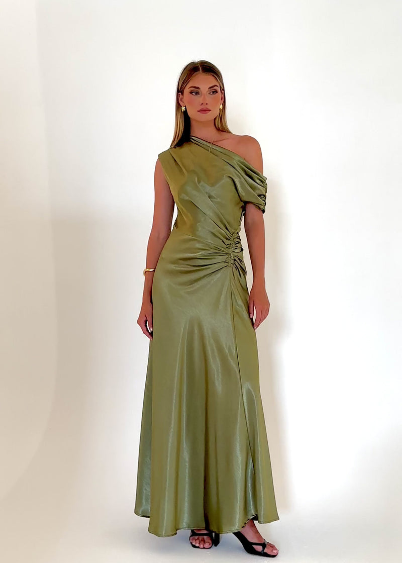 The Flirtini One Shoulder Maxi Dress in Olive is understated yet chic. Style with gold jewellery, heeled sandals, and a sleek clutch for dinners or summer events. Works beautifully with matching tones or neutral accessories for a pulled-together finish.