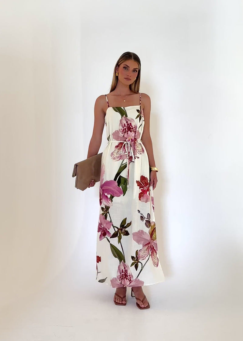 Bold and romantic, the Freya Maxi Dress – Floral Fantasy shines at parties, weddings, or special occasions. Style with statement earrings and heels for impact.