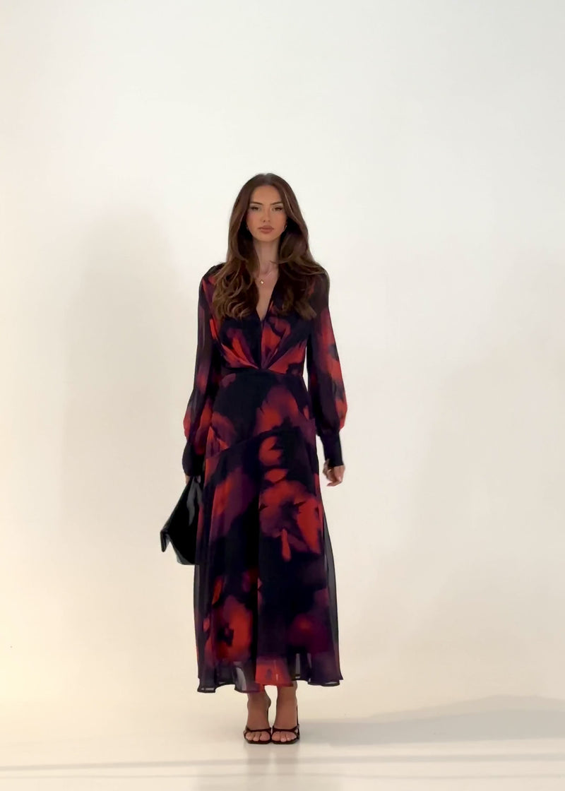 Moody florals take the lead in the Frida Maxi Dress in Black Watercolour. Style with ankle boots, a leather shoulder bag and simple hoops for a cool, effortless look. Layer with a coat for cooler weather.