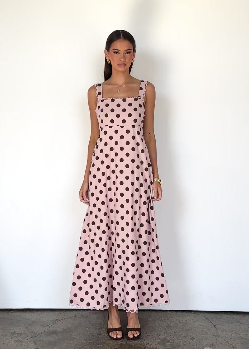 Charming and flirty, the Grayce Maxi Dress in blush polka is made for brunches, beach dates, and weekend getaways. Style it with nude heels, gold jewellery, and a woven bag for a soft feminine look that never goes out of style.