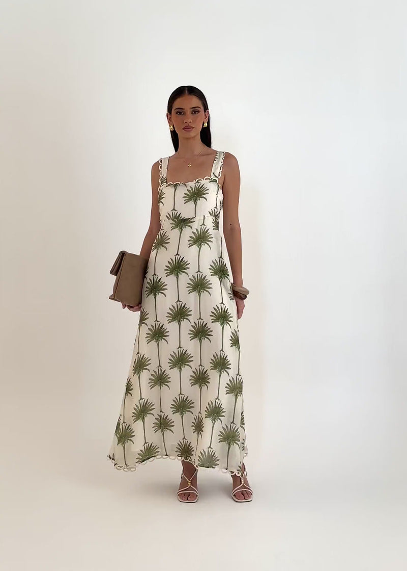 Bring tropical vibes wherever you go with the Grayce Maxi Dress in sage palms. Pair it with slides and a woven tote for beach days, or elevate it with block heels and bold earrings for garden parties.
