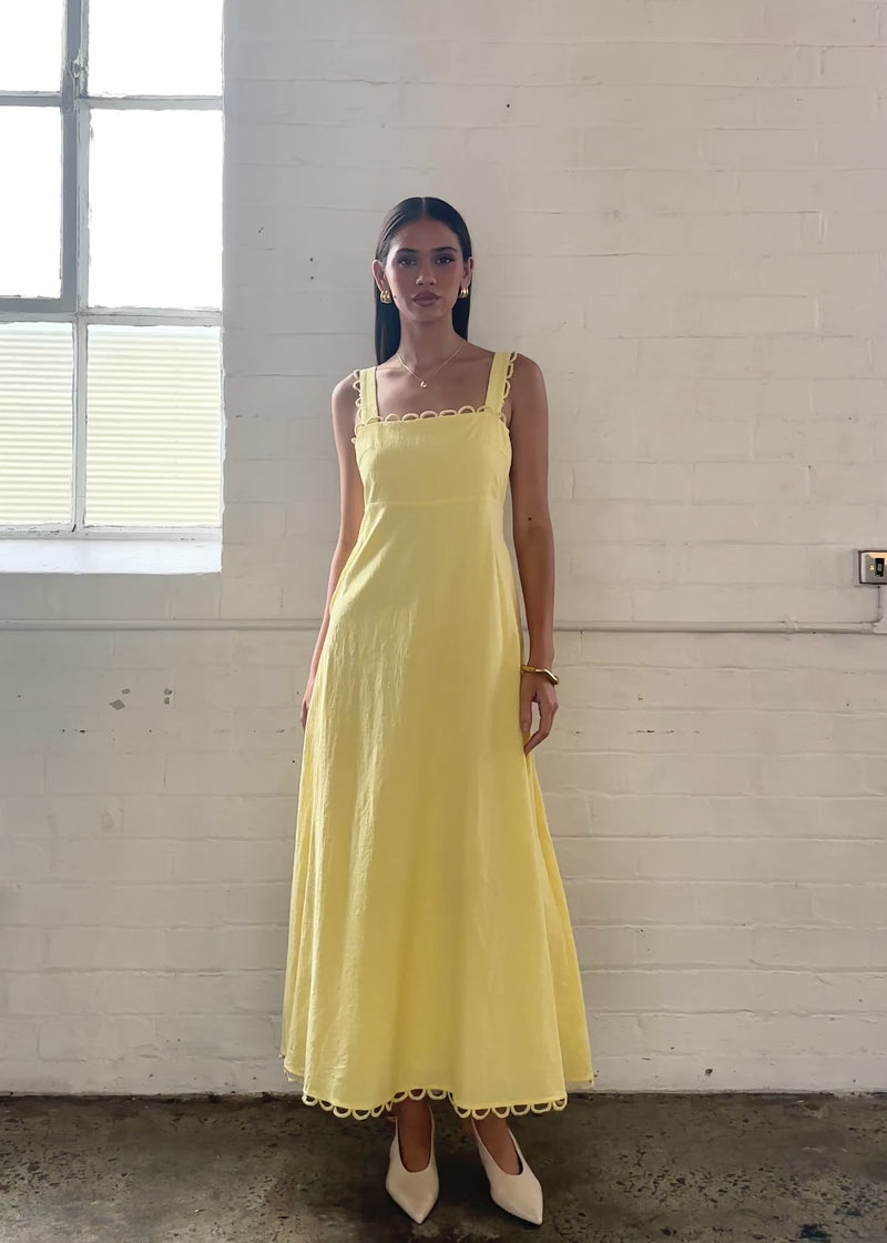 Brighten any occasion with the Grayce Maxi Dress in yellow. Throw on a denim jacket and sneakers for casual weekends, or dress it up with gold hoops and nude heels for summer events.