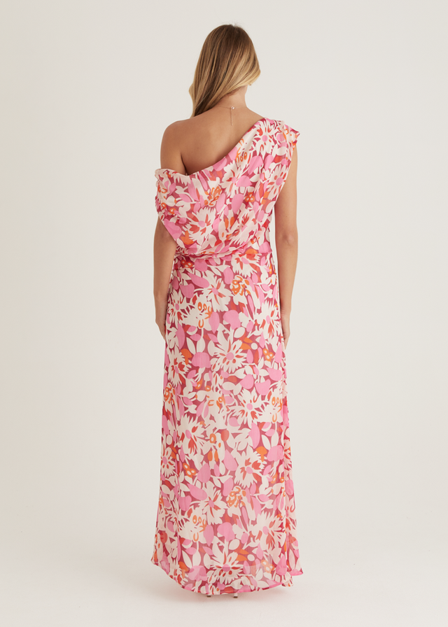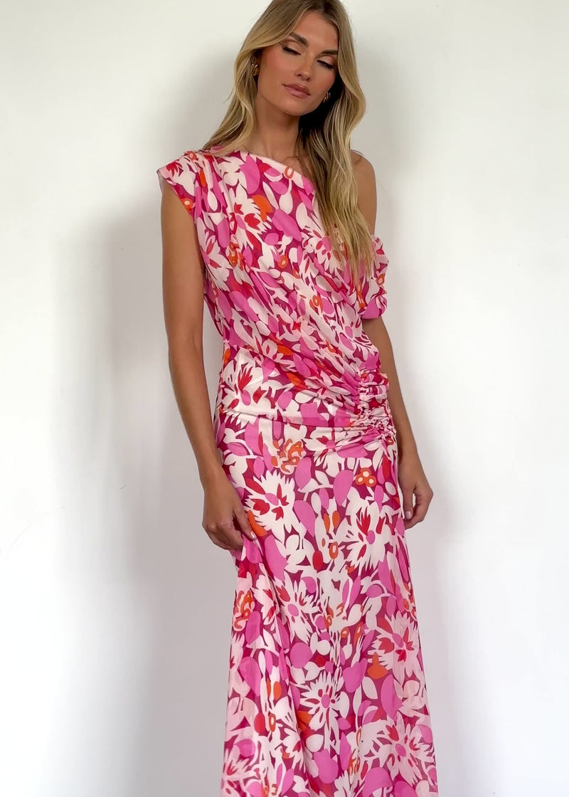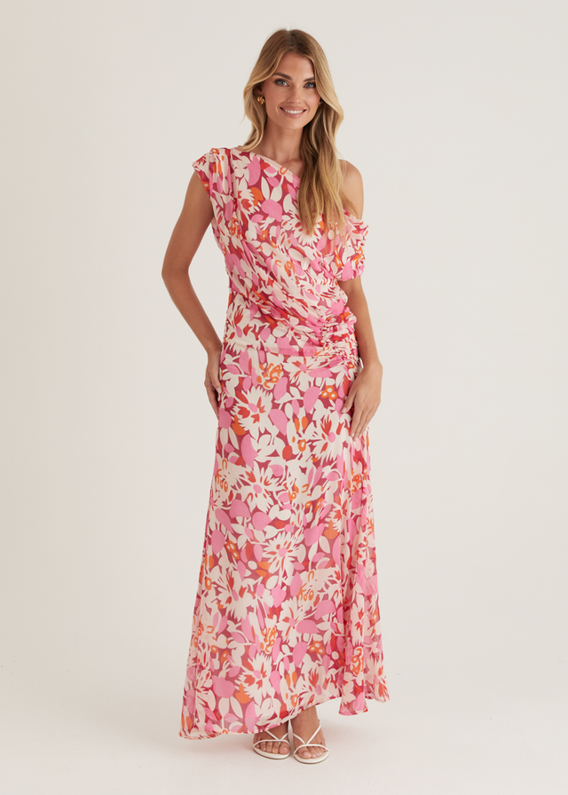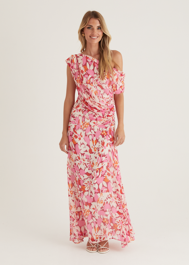 The Helix Off Shoulder Midi Dress in Rio Pink offers a striking balance of bold and feminine. Style it with soft waves, nude heels, and a delicate clutch for an effortlessly elegant look. Add simple gold hoop earrings to finish.